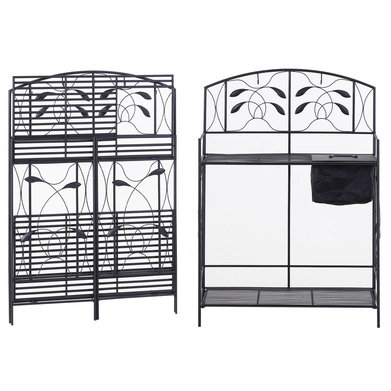 In a world full of wood potting benches, this Black Metal Potting Bench with Wrought Iron Vine Details and Fabric Potting Sink really knows how to stand out. Finished in classic black and featuring impressive scrollwork and vine details throughout, this potting bench is as charming as it is functional. Integrated hooks all along the top give you plenty of places to hang your gardening tools, while the ample workspace and fabric potting sink help you get your work done. The lower shelf is perfect for storing boots, bags of potting soil or extra pots. Some assembly is required. Easy to maintain. Working surface height is 30 inches.