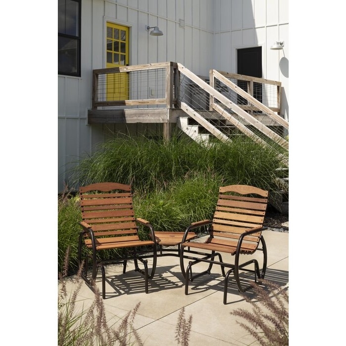 Sit back as you soak up the sun or sip sangria outside with the Modern FarmHome 3 Piece Glider Chairs Set with Side Table. Chair is a compromise to a bench-style glider. This allows each person to have control of their own gliding motion and provides a small table in between each seat. This is timeless in style and built to last for many years to come.