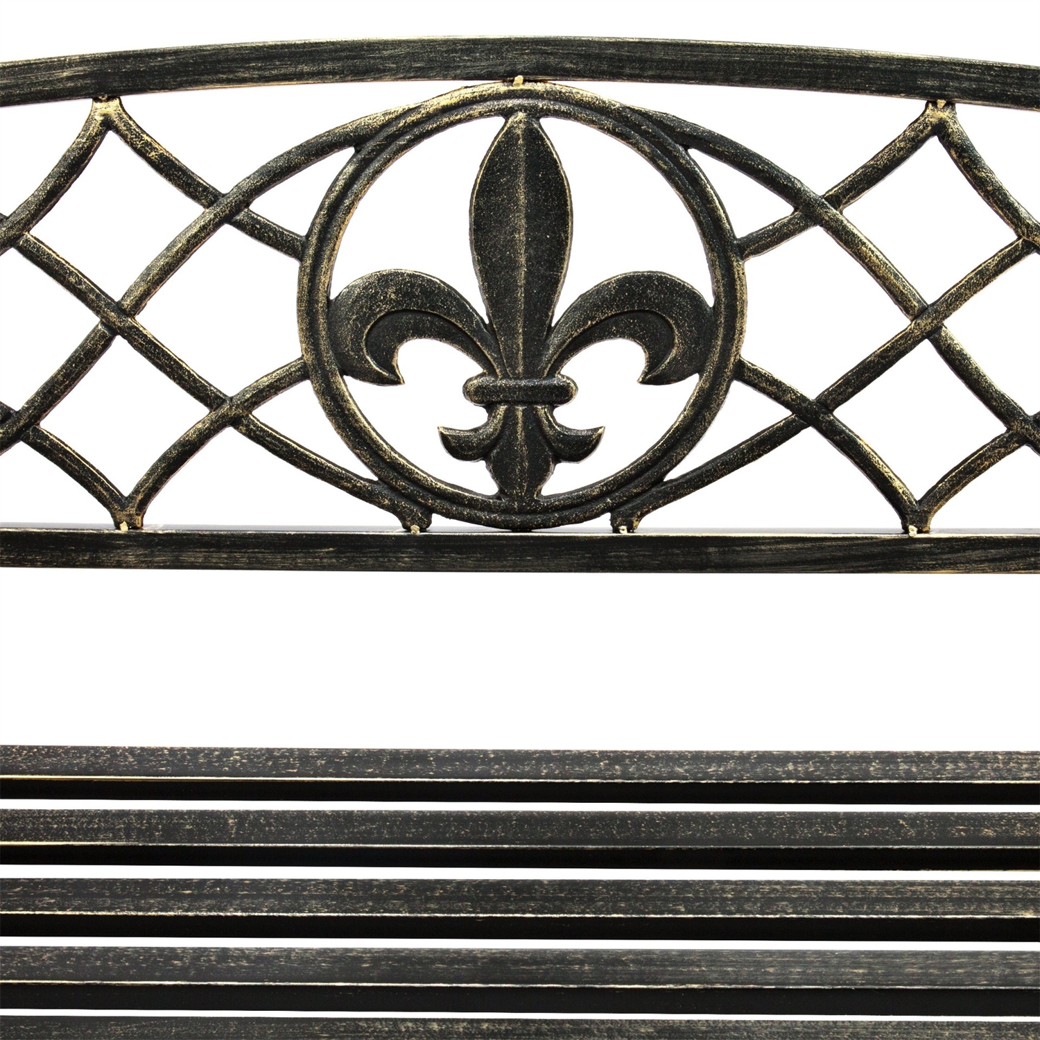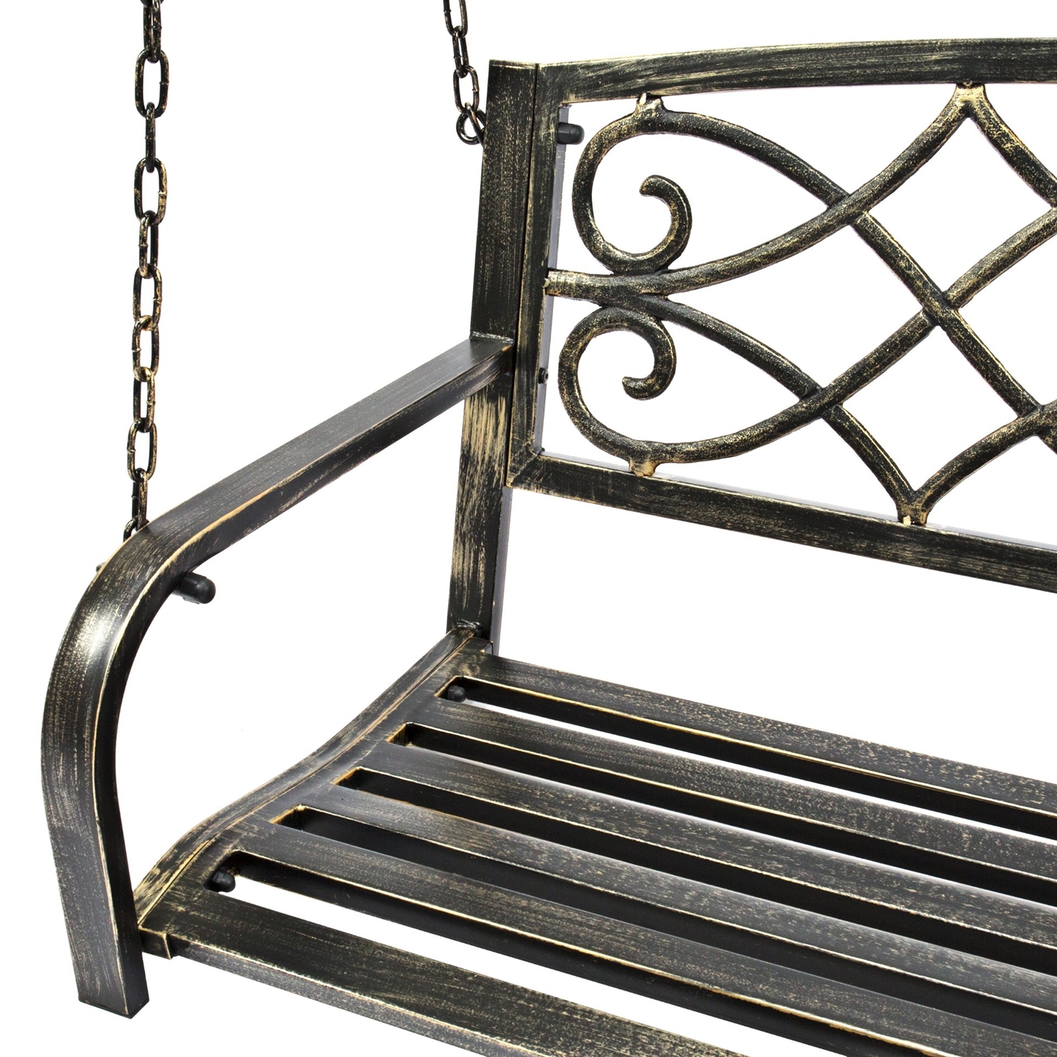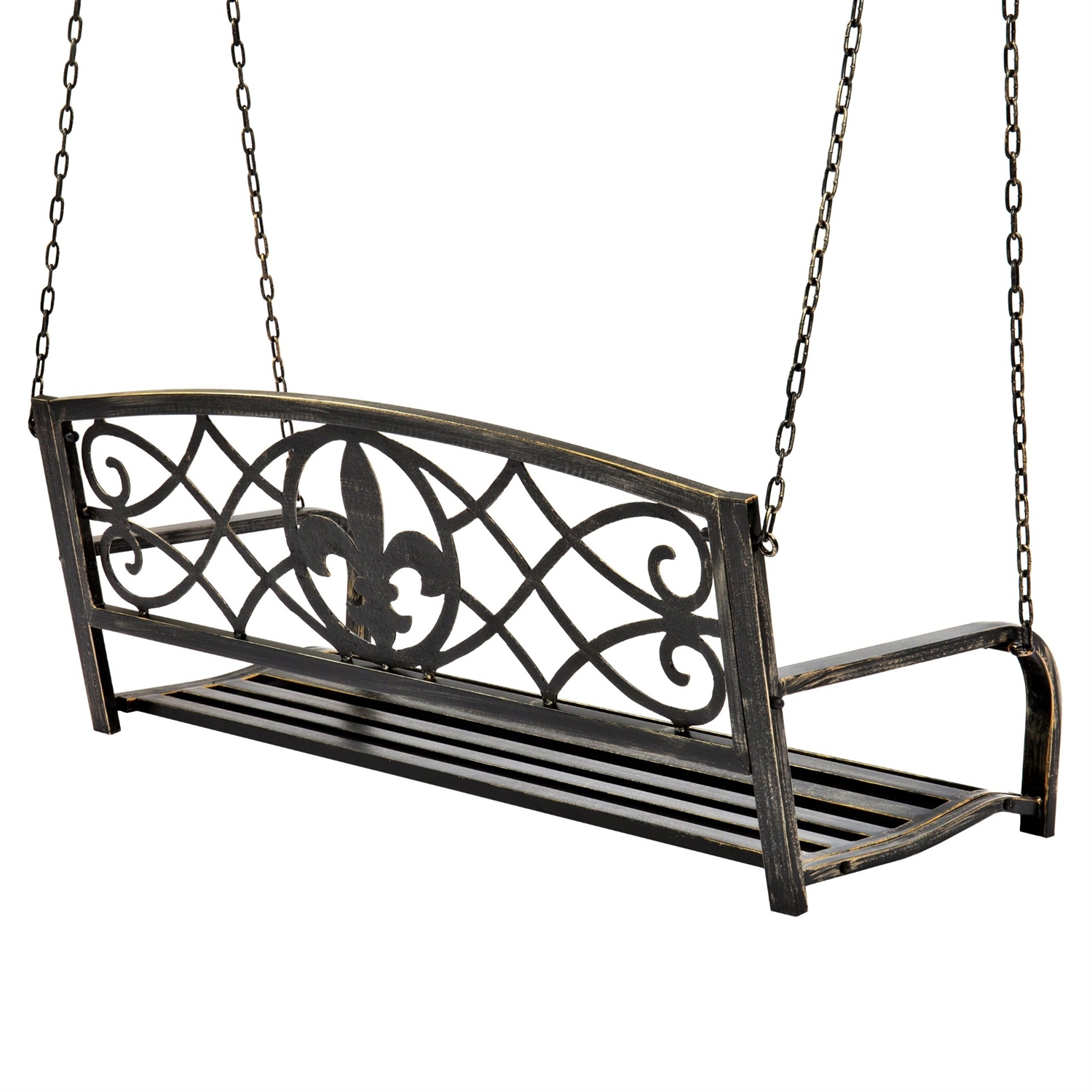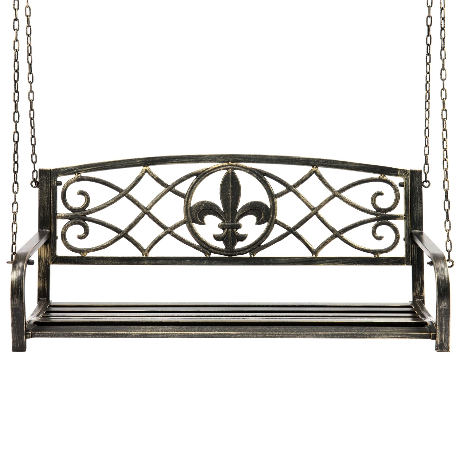 Swing in style with the Farm Home Bronze Sturdy 2 Seat Porch Swing Bench Scroll Accents. Crafted with a sleek, rustic design sure to blend well with your home's porch or patio decor. This classic, eye-catching swing bench boasts a fleur-de-lis design in the center of its back for a touch of refined beauty.Lounge outside for some you time or hang out with a friend, as the bench can easily seat 2 people. Made of heavy-duty metal, this bench withstands the elements to resist rust buildup and last through the years.