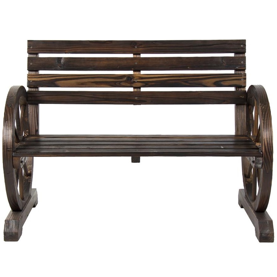 Seats taken!! Come rest your bones on the 2 Person Farm Home Wagon Wheel Wooden Bench. Crafted of solid fir wood with a dark brown finish, this durable bench is built to be a lasting cornerstone for your outdoor living. This 2-person bench adds a touch of country charm to your backyard or garden with its elegant, rustic design, great for your farm or barn. The bench's curved armrests offer an eye-catching silhouette that provides comfortable lounging for you and a guest. Its lightweight design allows for easy portability, letting you to move this bench around for a change of scenery without the hassle.