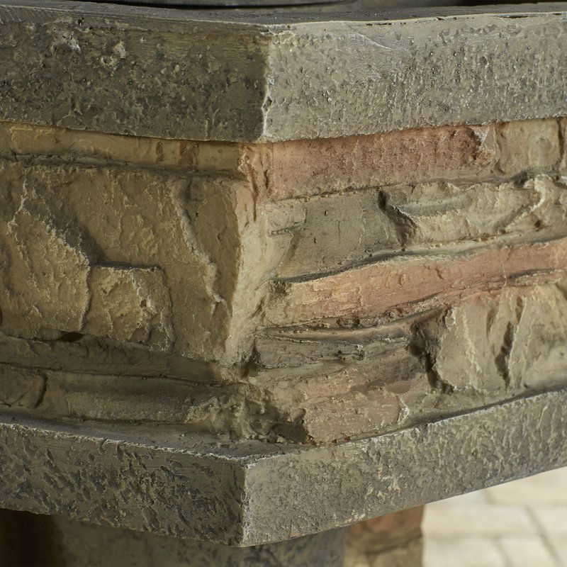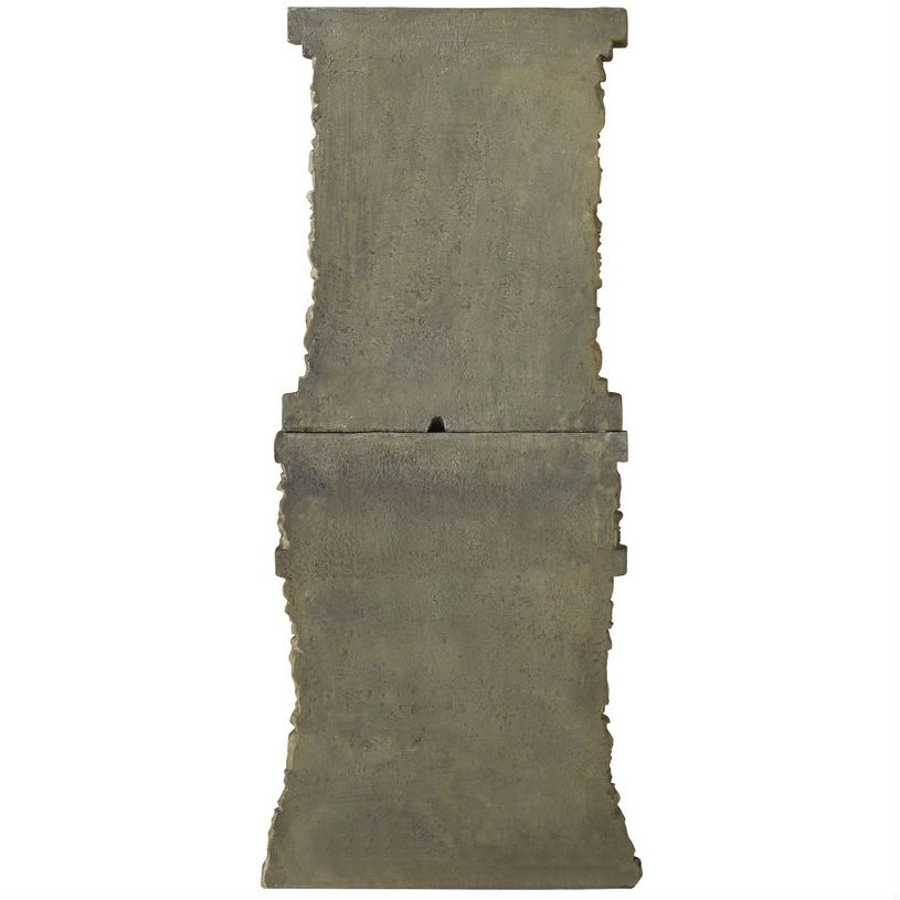 This Indoor / Outdoor Water Fountain with Bronze Hued Lion Head is a classic fountain design that will add traditional style to your outdoor spaces. It features a lions head and two tiered design. Water cascades gently from one level to the next, creating a pleasant look and sound. The flow of the water starts at the mouth of the bronze-hued lion head. From there, it pours into an ancient pot design. From three spigots water continues to fall into the larger lower basin over a fluted pedestal base. The sound of water cascading down the tiers of the fountain will present a serene background sound for your garden, patio or deck. The beautiful design is crafted of weather-resistant polyresin and fiberglass. Its expertly sculpted to look and feel like a natural stone wall. Its topped by simulated concrete crown molding. Placed against a wall or fence, the silhouette will look like an ancient fountain wall has been preserved in your yard.