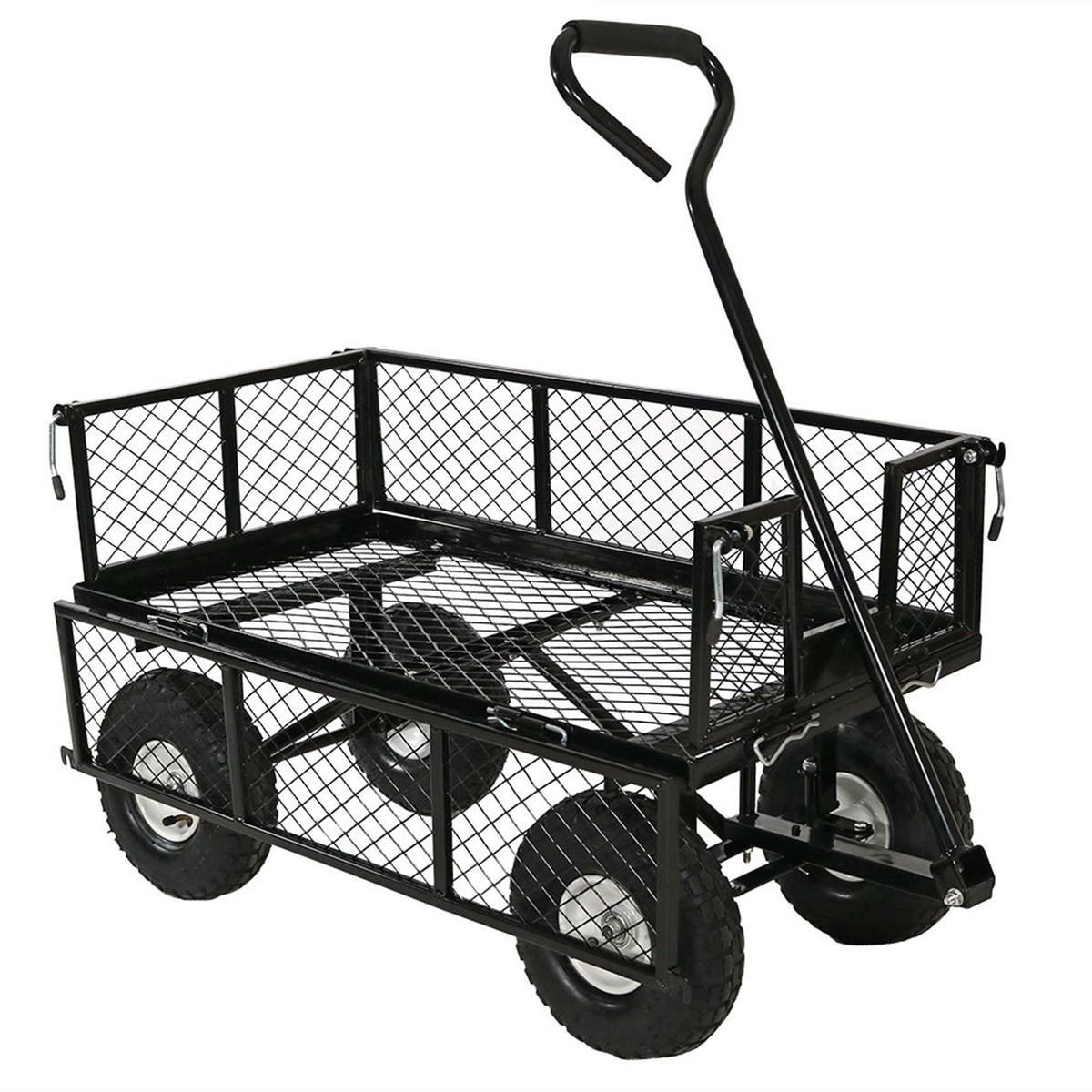 With a 660-pound hauling capacity, the options are endless when it comes to moving large items with this Heavy Duty Black Wheelbarrow Steel Log Garden Cart. The multi-use wagon sides can be folded down or completely removed by pulling out the side pins, creating a useful flatbed cart. The convenient u-shaped quick-release hook located on the bottom of the frame makes unloading a quick and effortless process. The 70" collapsible wagon is made from durable steel mesh materials with a powder-coated finish making this product weather-resistant and long-lasting. The large D-shaped padded handle allows the utility cart to be towed or pulled by hand.