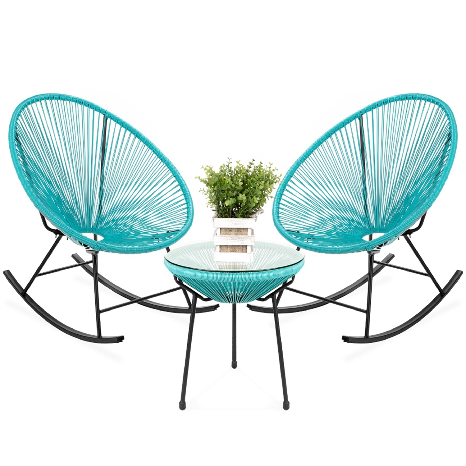 Rock out in your backyard with this 3 Piece Teal Blue Oval Patio Woven Rocking Chair Bistro Set. The sturdy oval chairs have an ergonomic high-back design. Chairs are woven with firm, yet flexible ropes that you can sink into for optimal comfort. Designed with cornered rocker legs for a controlled rock that lets you move back and forth with easy. Crafted with handwoven, weather-resistant plastic rope over a powder-coated steel frame for long-lasting use.
